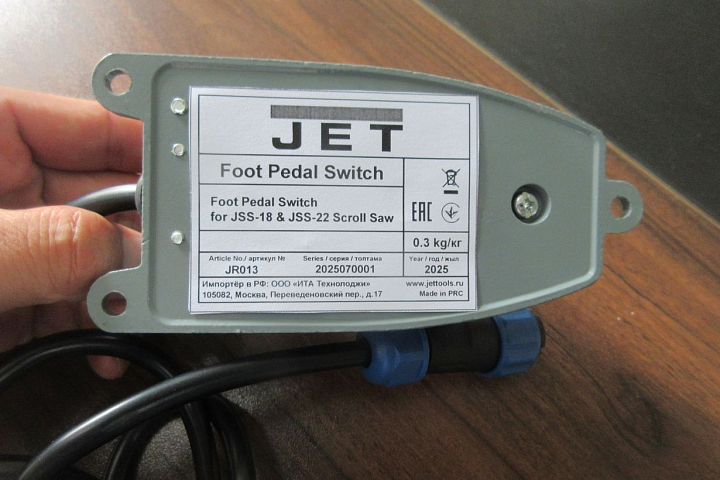Абсолютно новая опция JET для новых моделей лобзиковых станков. Данный переключатель создан специально для лобзиковых станков JET. Полностью готов к работе. В станке все подготовлено для его установки. Воткнули в разъем и пользуйтесь. Раньше в моделях JET такой опции не существовало. Теперь есть. Удобно, так же как в швейной машинке или в автомобиле. Руки держат материал, а ногой запускаем и останавливаем станок. Для лобзикового станка такая опция крайне важна. Ведь здесь обе руки необходимы для удержания заготовки.